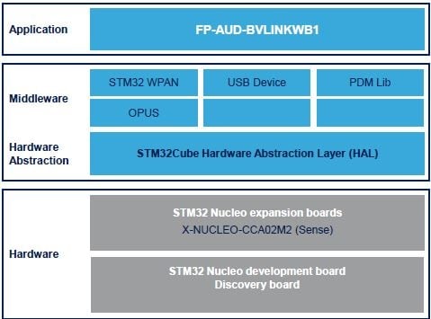 FP-AUD-BVLINKWB1 is an STM32Cube function pack that performs full-duplex voice streaming or stereo music streaming over BLE using the advanced Opus compression algorithm.