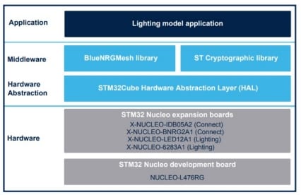 The software lets you easily create your own application for extending Bluetooth® mesh networks (by offering a ready-to-use mesh core library), a complete set of compatible APIs, and a lighting demo application running on either X-NUCLEO-IDB05A2 or X-NUCLEO-BNRG2A1, X-NUCLEO-LED12A1 and X-NUCLEO-6283A1 expansion boards connected to a NUCLEO-L476RG development board.