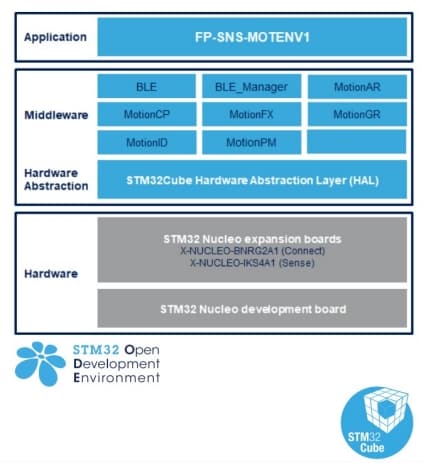 FP-SNS-MOTENV1 is an STM32Cube function pack, which lets you connect your IoT node to a smartphone via BLE and uses a suitable Android™ or iOS™ application, such as the STBLESensor app, to view real-time motion and environmental (such as temperature and relative humidity) sensor data.