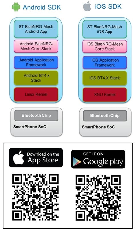 STBLEMesh application for Android and iOS allows you to create your own Bluetooth® Mesh Profile compliant mobile Apps. The App can be used for provisioning, configuring and controlling multiple Bluetooth® Mesh Profile compliant devices in a BLE Mesh network for Internet of Things (IoT) solutions. Pre-compiled, ready-to-use Apps based on STBLEMesh SDK are available on Google Play and iTunes stores for a quick evaluation.