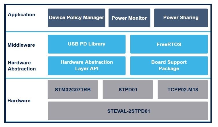 The STSW-2STPD01 embeds two software IPs, the Power Sharing algorithm and the Power Monitor, which allow the STM32G071RB microcontroller to optimize the management of the power in the solution.