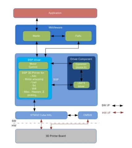 固件被划分为一个包含STM32Cube微控制器和外设驱动的驱动部分,一个包含STM32Cube FatFs和Marlin算法(用于运动控制、G代码等)的中间件部分,以及一个包含用户指令入口点的应用部分。