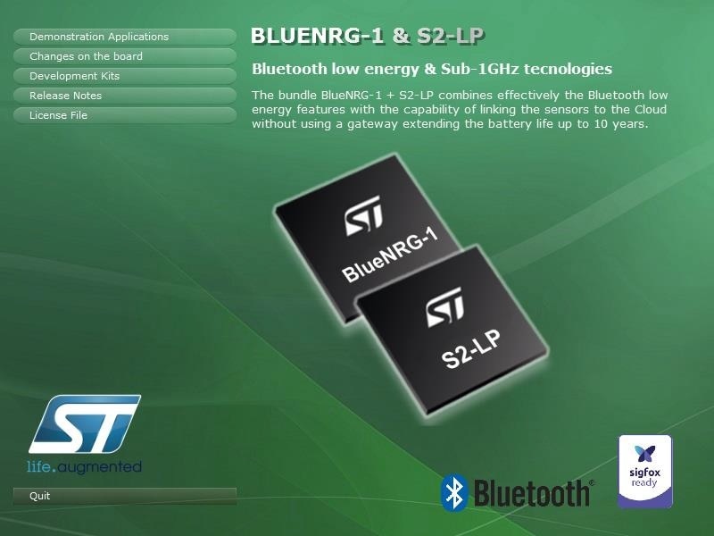该软件包支持相关网页上的BlueNRG-1/2和S2-LP套件平台,用于构建双射频应用。该软件包提供了一套BLE演示应用,结合了蓝牙低功耗场景和sub-1 GHz技术的长距离通信能力。