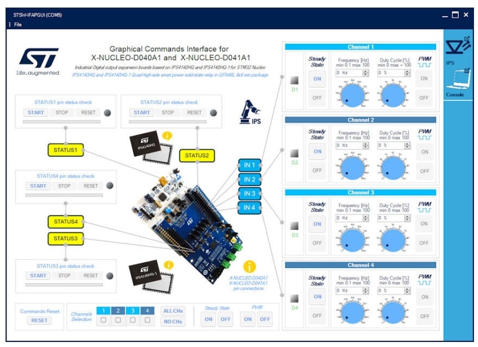 - 通过STSW-IFAPGUI图形用户界面可完全控制X-NUCLEO-DO40A1和X-NUCLEO-DO41A1扩展板