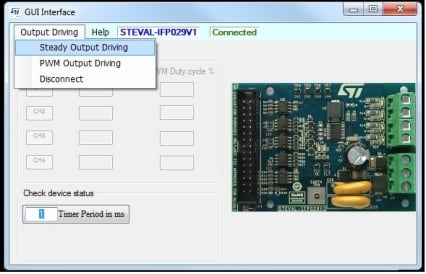 The Steady State driving mode allows the static setting of the output stage ON (= VCC) or OFF (= GND) of the STEVAL-IFP029V1.