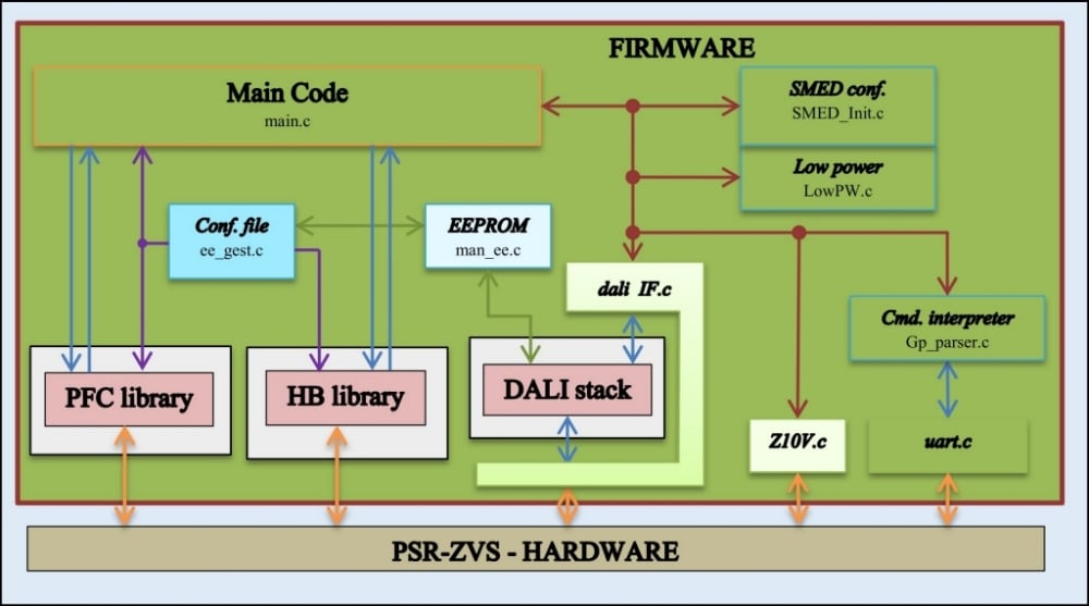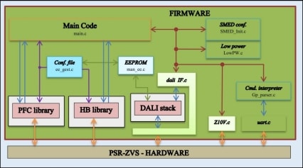 The firmware controls the PFC stage and drives the half-bridge stage to generate a constant current on the LED string.