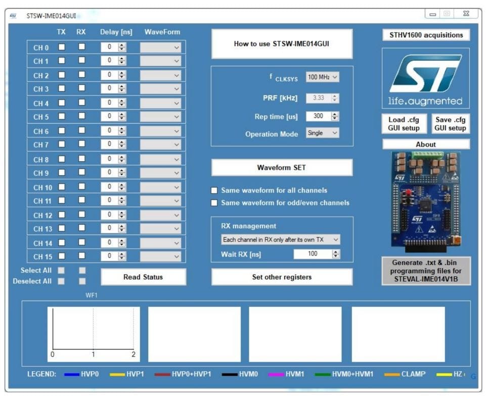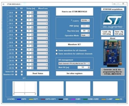 The graphical user interface for the STEVAL-IME014V1B evaluation kit helps to configure the STHV1600 16-channel high voltage pulser for ultrasound imaging applications and build custom waveforms to test the device.