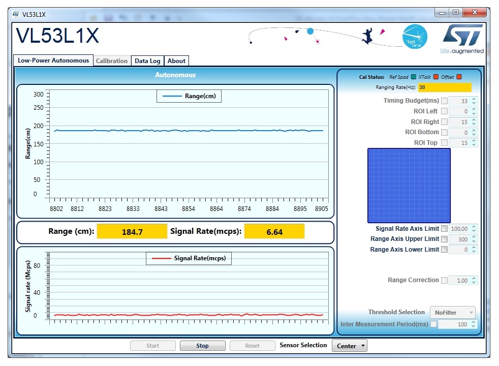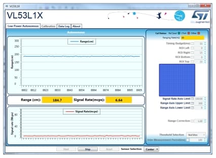 The STSW-IMG008 is a graphical user interface (GUI) for Windows 7, Windows 8, and Windows 10. The GUI controls the P-NUCLEO-53L1A1 pack which consists of the X-NUCLEO-53L1A1 expansion board connected to the STM32F401RE nucleo board.