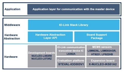 The package includes an IO-Link Stack v.1.1.3 library and the drivers for the L6362A transceiver mounted on the STEVAL-IOD003V1 evaluation board, and MEMS sensors mounted on the X-NUCLEO-IKS01A2 expansion board.