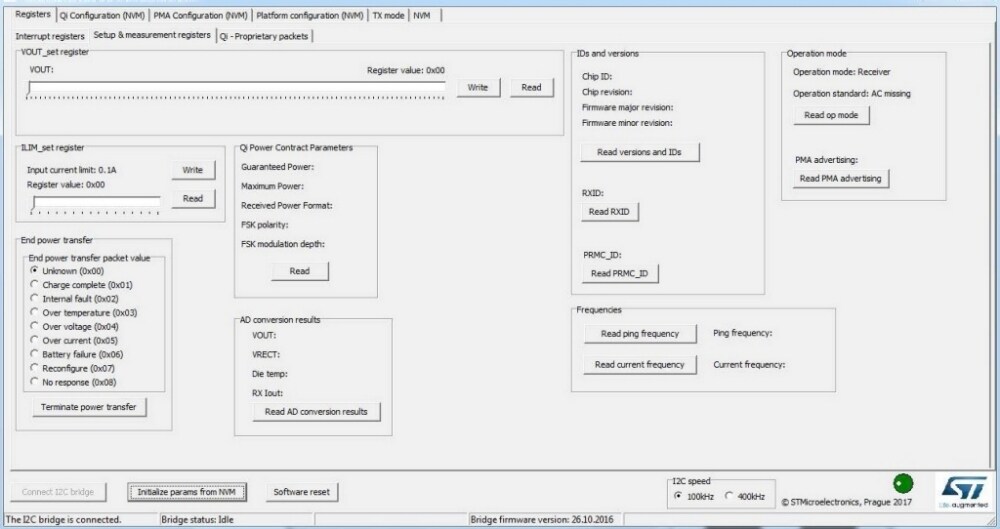 It provides access to all user registers and allows reading of the ADC measurement results and measured frequencies (at ping and actual operating frequency), defining the parameters for Qi and PMA modes independently.