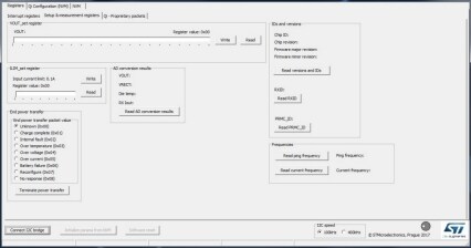 The GUI facilitates communication with the STWLC33 wireless power receiver. Through the GUI, you can access the user registers, read ADC and frequency (at ping and actual operating frequency) measurements.