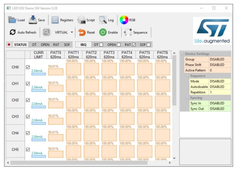 The STSW-LED1202GUI software offers a graphical interface to read and configure registers on the 12-channel LED1202 LED driver IC and save settings on your PC.