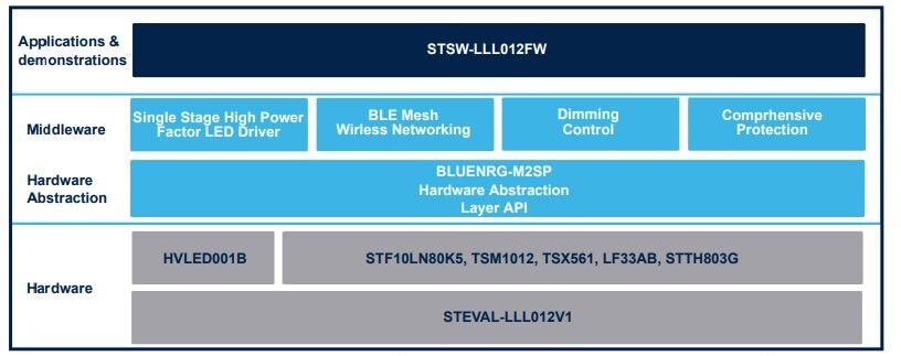The firmware runs on the BLUENRG-M2SP integrated wireless module on the STEVAL- LLL012V1, featuring the HVLED001B high brightness LED driver.