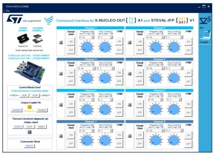 - Full control of the X-NUCLEO-OUT11A1 and X-NUCLEO-OUT13A1 expansion boards via the STSW-IFAPGUI graphical user interface