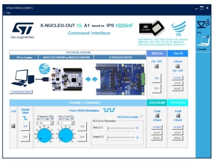 - Full control of the X-NUCLEO-OUT15A1 expansion board via the STSW-IFAPGUI graphical user interface