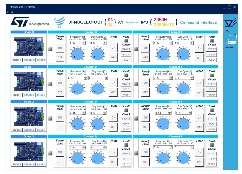 - Full control of the STDES-OUT03DO8 and STDES-OUT04DO8 octal digital output modules via the STSW-IFAPGUI graphical user interface