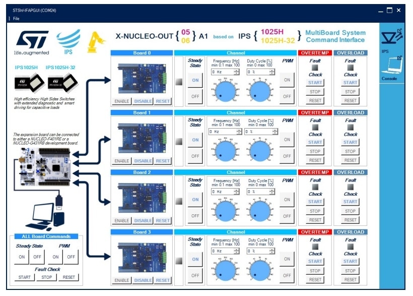 - Full control of the STDES-OUT05DO4 and STDES-OUT06DO4 quad digital output modules via the STSW-IFAPGUI graphical user interface