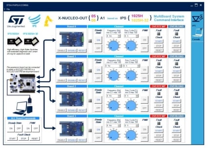 The firmware can control up to four expansion boards (X-NUCLEO-OUT05A1 or X-NUCLEO-OUT06A1).