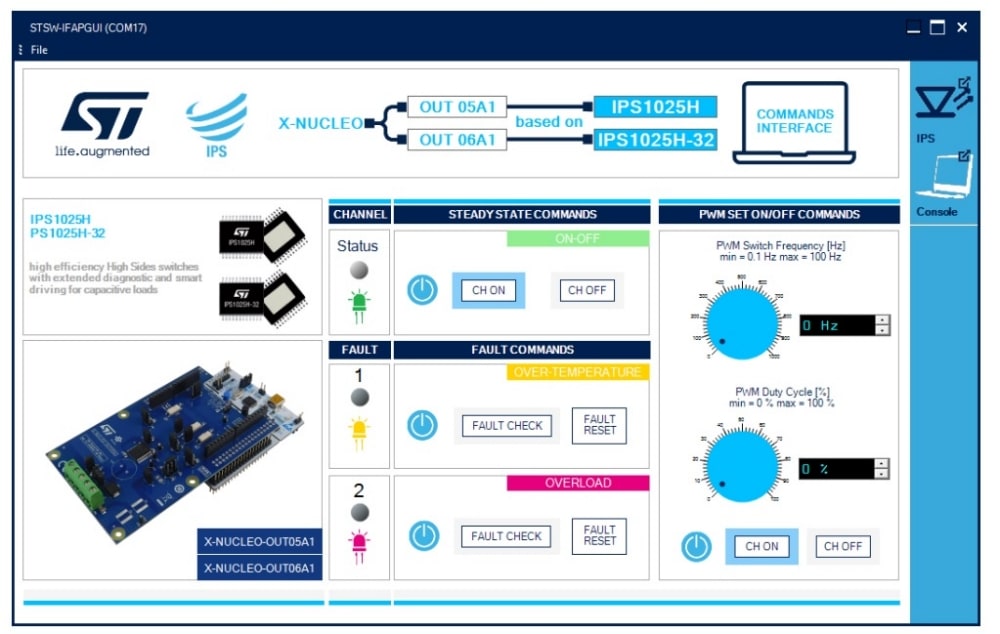 - Full control of the X-NUCLEO-OUT05A1 and X-NUCLEO-OUT06A1 expansion boards via the STSW-IFAPGUI graphical user interface