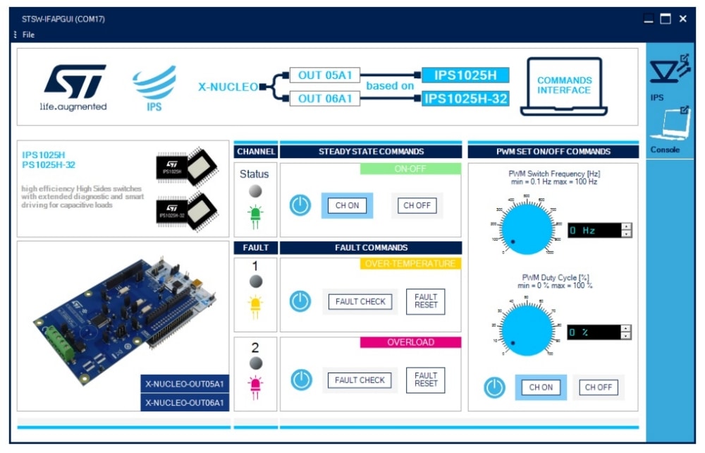 STSW-OUT5G4固件运行在NUCLEO-G431RB开发板上,可通过STSW-IFAPGUI图形用户界面控制X-NUCLEO-OUT05A1或X-NUCLEO-OUT06A1扩展板。