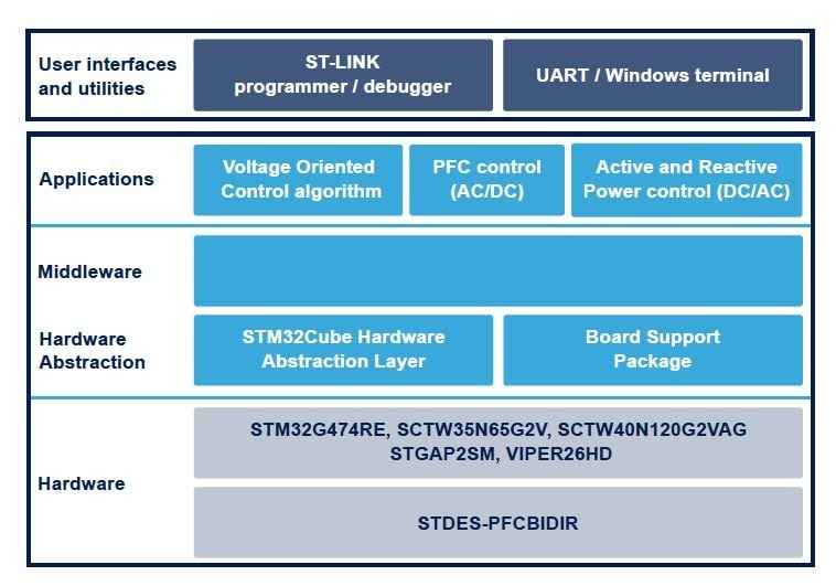 The firmware provides comprehensive three-phase, three-level and two-level AC/DC and DC/AC power conversion control on the STM32G474 mixed-signal MCU optimized for Digital Power. The firmware includes a sophisticated voltage oriented control (VOC) algorithm to control either the Power Factor in AC/DC conversion or the AC output power (active and reactive) in DC/AC conversion.