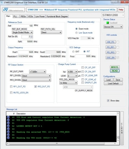The kit includes PC-compatible software with a Graphical User Interface (STSW-RFSOL002) allowing the user to write and read all device registers. This gives direct control of circuit functions such as: operating frequency, reference frequency, input mode, charge pump current and low-power modes.