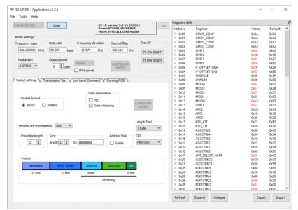 S2-LP_DK GUI应用程序为S2-LP上的寄存器提供了一个交互式PC界面,其主要功能是为最常见的应用以用户友好的方式配置模拟无线电部分和数据包处理器。