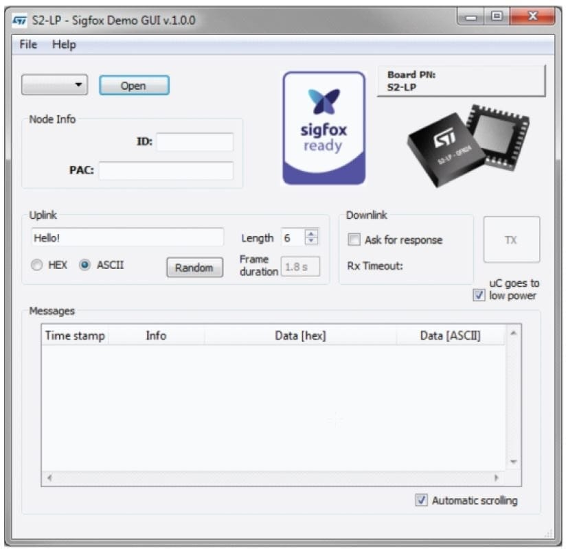 The S2-LP - Sigfox Demo GUI PC application provides an interactive interface to transmit messages to the Sigfox network and program the S2-LP nodes with the Sigfox ID to set the node for network communication.