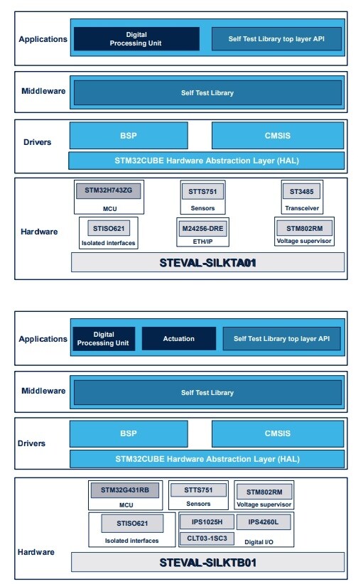 The STSW-SILKT01 firmware has been developed using IAR workbench 8.5.9. It is compliant with the STM32 Cube framework and offers an application example with the main features necessary at firmware level to control a system in the range of functional safety, for the application use cases where a SIL3 level is required.