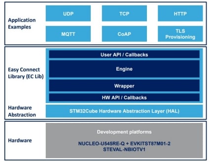 The easy connect library (EC_Lib) is a comprehensive C-based software library designed to enable seamless interaction with the ST87M01 NB-IoT module. It provides a high-level abstraction layer that simplifies access to the module's core functionalities, including NB-IoT connectivity and GNSS positioning. Delivered as source code, the library allows developers to efficiently integrate and control the ST87M01 module within their applications.