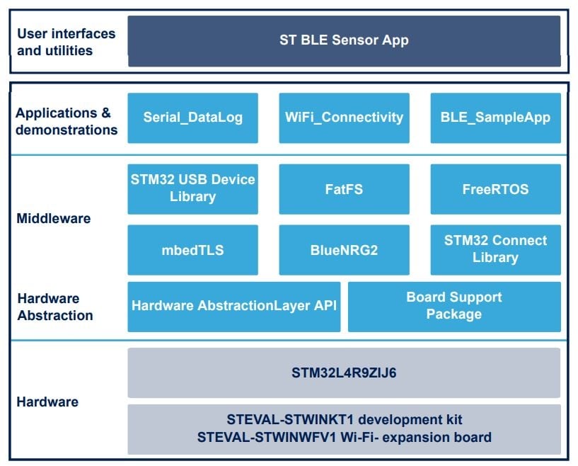 Other two projects demonstrate wireless connectivity using Bluetooth and Wi-Fi. The Bluetooth project allows you to stream environmental sensor data via the Bluetooth Low Energy (BLE) protocol, and is compatible with our freely available ST BLE Sensor app on Android and iOS stores, so you can read and manipulate the data from your mobile device. The Wi-Fi project requires the STEVAL-STWINWFV1 Wi-Fi expansion board (not included in the kit) to implement basic network functionality including pinging a remote station, connecting to a TLS secure server, sending data to an echo server and verifying returned data, and running a server that a remote client can connect to.