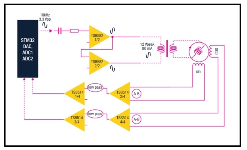 The STSW-TTM005 is an STM32 firmware application example that estimates the rotor angular position and speed, providing the excitation signal and decoding the resolver sin and cos signals.