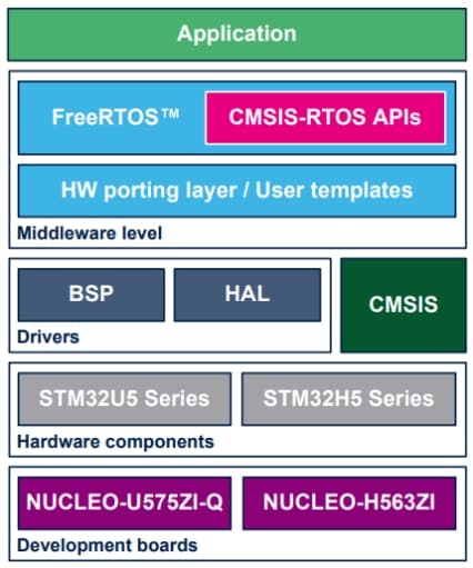 X-CUBE-FREERTOS(适用于STM32Cube的FreeRTOS™软件扩展)在STM32Cube环境中为STM32C0系列、STM32H5系列、STM32U5系列和STM32WBA系列微控制器提供了完整集成的FreeRTOS™内核。为NUCLEO-C031C6、NUCLEO-H563ZI、NUCLEO-U575ZI-Q和NUCLEO-WBA52CG评估板提供的即用型应用实例,以及与STM32CubeMX和STM32CubeIDE实现完全兼容可以确保X-CUBE-FREERTOS大幅缩短学习周期,并可利用FreeRTOS™内核以及STM32C0、STM32H5、STM32U5和STM32WBA微控制器实现流畅的应用开发体验。