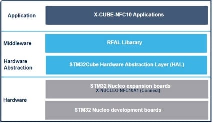 The X-CUBE-NFC10 software expansion for STM32Cube provides a complete middleware for STM32 to build applications using NFC/HF RFID reader IC (ST25R200 device).