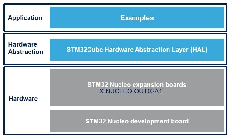 The software comes with a sample implementation of the driver running on the X-NUCLEO-OUT02A1 expansion board connected to a NUCLEO-F401RE or NUCLEO-F334R8 development board.