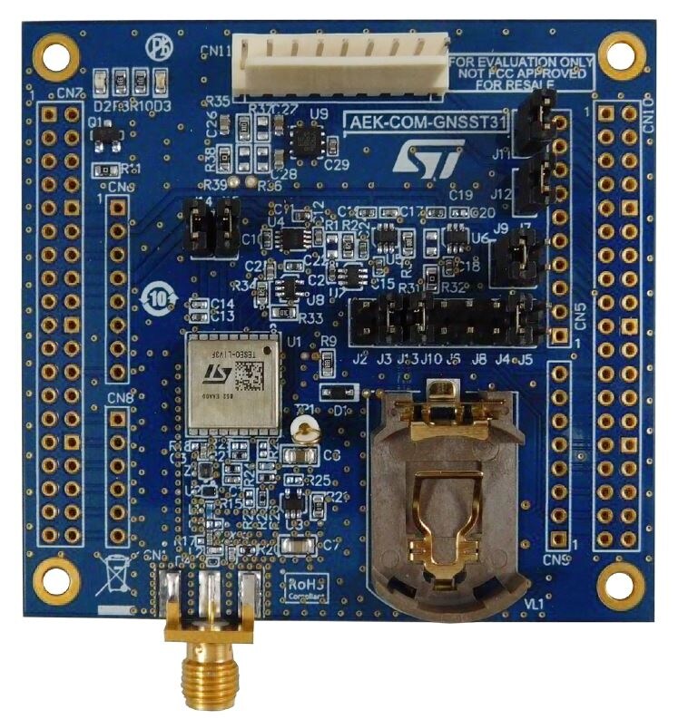 The AEK-COM-GNSST31 evaluation board is based on the certified Teseo-LIV3F global navigation satellite system (GNSS) module with embedded TeseoIII single die standalone positioning receiver IC.