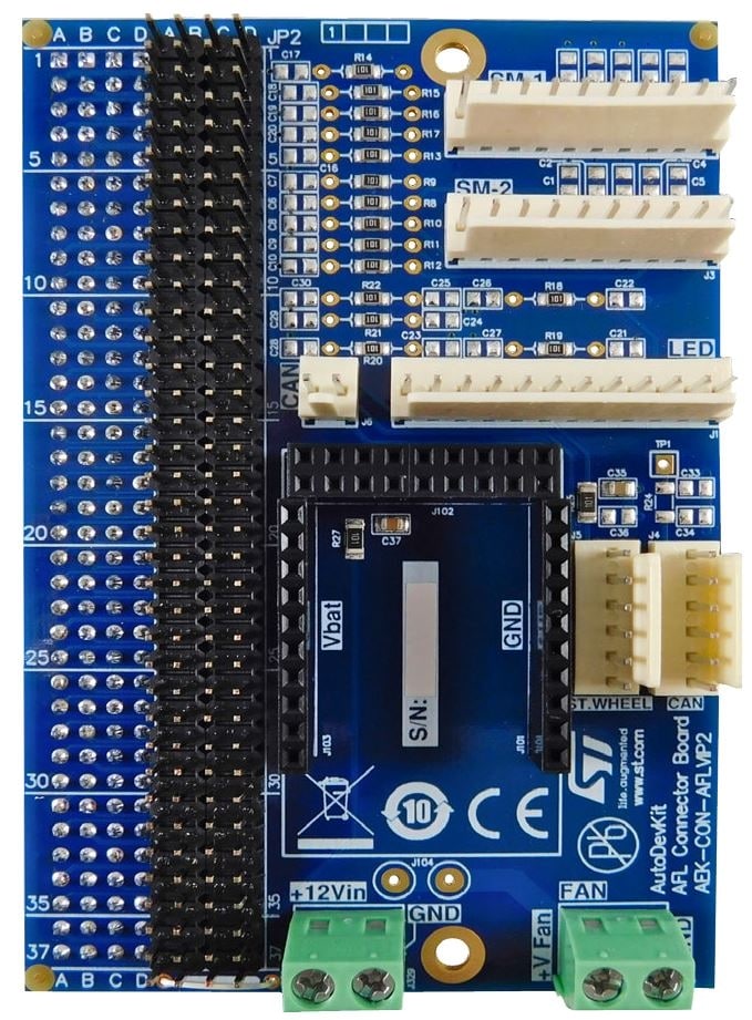 The board can connect an MCU discovery board, such as the AEK-MCU-C4MLIT1 (with 4x37 connector), with two AEK-MOT-SM81M1 stepper motor boards governing low beam direction (left-right and up-down), and a AEK-LED-21DISM1 LED driver board capable of supplying the different LED lights included in a modern front headlight assembly. It can also connect a high-side switch board from the EV-VNx range (e.g., EV-VN7050AS) to control a cooling fan for the LED headlight.