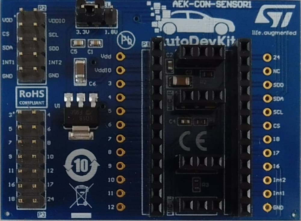 The AEK-CON-SENSOR1 connector board is designed to interface MEMS sensor boards in DIL 24 socket to an SPC5 MCU discovery board like the AEK-MCU-C4MLIT1 hosting a SPC58EC80E5 Chorus family automotive MCU with 4 MB flash.
