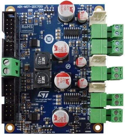 The AEK-MOT-2DC70S1 is a very compact solution for multi DC motor driving applications, embedding all the driver and signal decoding functions on the same board.