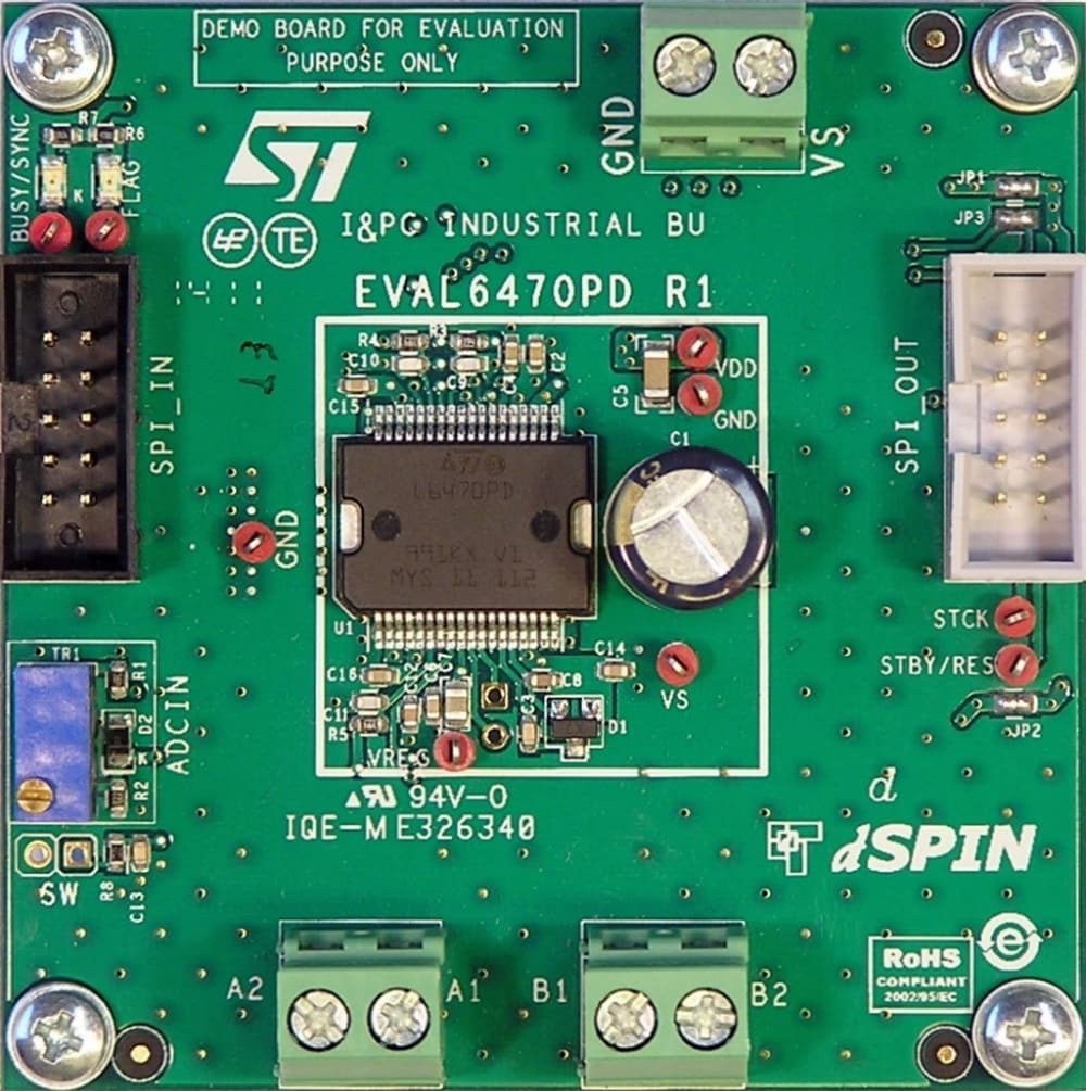 The EVAL6470PD demonstration board is a fully integrated microstepping motor driver. In combination with the STEVAL-PCC009V2 communication board and SPIN evaluation software, the board allows the engineer to investigate all the features of the L6470 device. In particular, the board can be used to check the voltage mode driving and to regulate the L6470 parameters in order to fit the application requirements. The 4-layer layout and the PowerSO package allow the top thermal performance to be obtained. The EVAL6470PD supports the daisy chain configuration making it suitable for the evaluation of the L6470 in multi motor applications.