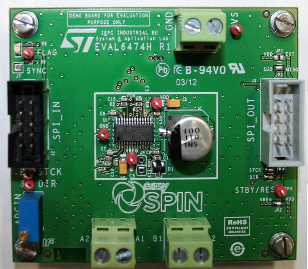 The EVAL6474H demonstration board is a microstepping motor driver. In combination with the STEVAL-PCC009V2 communication board and the SPIN evaluation software, the board allows the user to investigate all the features of the L6474 device.