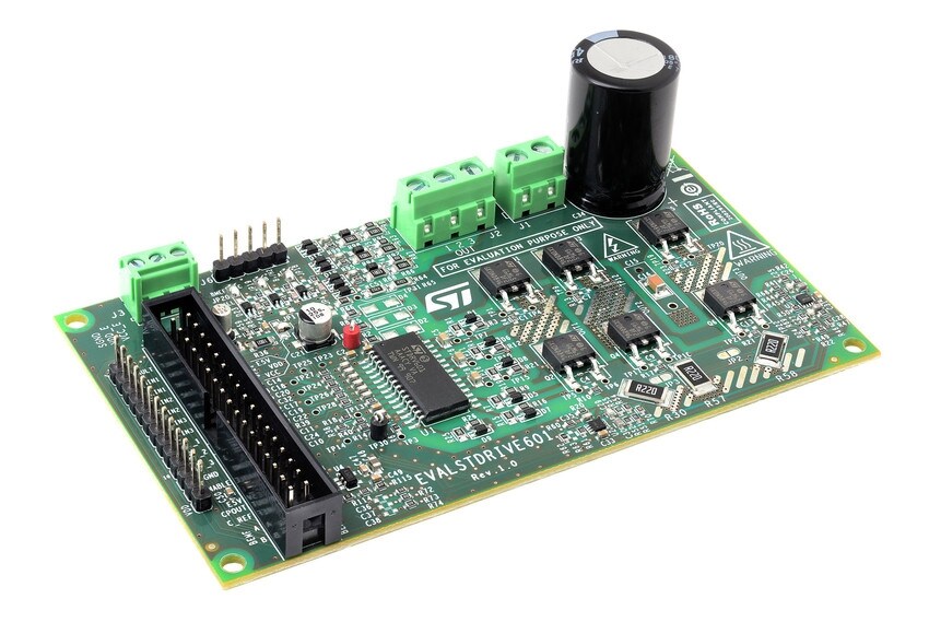The EVALSTDRIVE601 demonstration board is a complete 3-phase inverter which allows evaluating all of the STDRIVE601 features. The power stage features STGD6M65DF2 IGBTs, but can be populated with any IGBT or power MOSFET in DPAK or powerFLAT 8x8 HV package. The board is designed to support a three shunt or a single shunt current sensing topology.