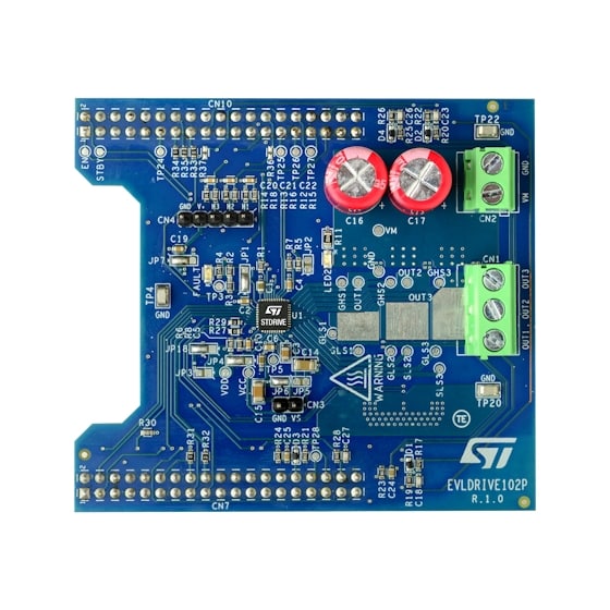 The EVLDRIVE102P evaluation board is a three-phase inverter based on the STL220N6F7 power MOSFETs. This evaluation board allows a full evaluation of the features of the STDRIVE102P, a triple half-bridge gate driver.