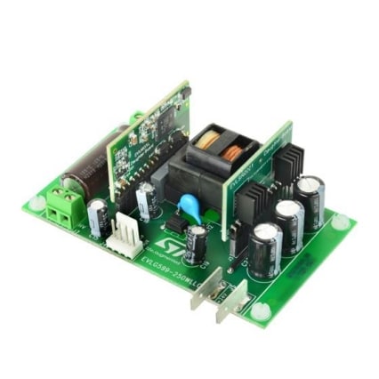 该转换器在24 Vdc的条件下,输出功率最高可达250 W。转换器提供过流、短路和过压保护。STNRG599A集成的高压启动电路可从交流主电源为IC供电以实现正常启动,无需辅助备用电源。还可为其他控制IC(例如PFC控制IC)提供电流。直流输入电压监测功能确保级联转换器按正确时序启动,防止在过低的输入电压下运行。