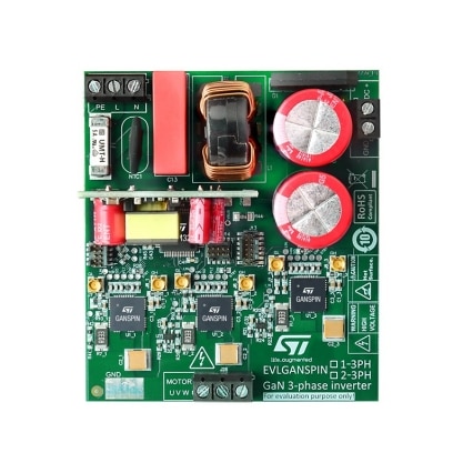 EVLGANSPIN1-3PH是一款三相逆变器,基于GANSPIN611半桥氮化镓系统级封装(集成138 mΩ、650 V增强型HEMT氮化镓和带LDO的栅极驱动器、自举二极管、过流保护)和STM32G431RB(配备170 MHz Arm Cortex®-M4 MCU、128 KB Flash存储器和数学加速器)。