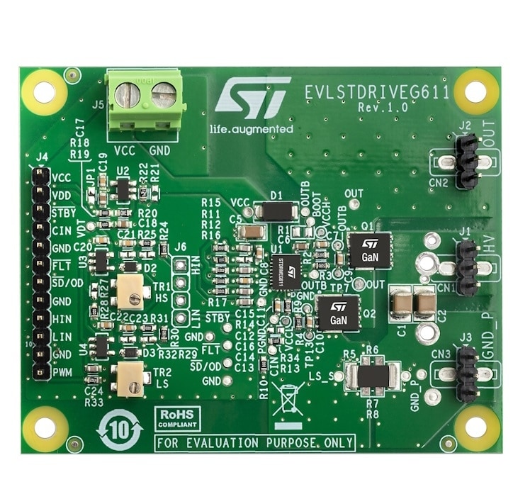 EVLSTDRIVEG611评估板简单易用且可快速适配,可用于评估STDRIVEG611驱动75 mΩ(典型值)、650 V增强型氮化镓开关(采用5x6 mm QFN封装)的特性。该评估板同样适用于评估STDRIVEG211的功能特性。