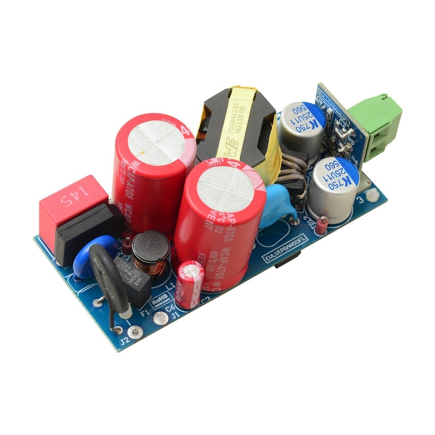 The main board contains, on the primary side, a diode bridge for double wave rectification, an input pi filter for EMI, a flyback transformer, the VIPERGAN50 and all the related components needed for polarization and features setting; on the secondary side, the output capacitors and the output rectifier, realized by a Power MOSFET driven by a synchronous rectifier for efficiency optimization.