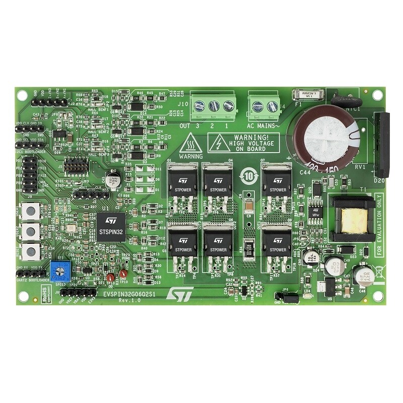 The EVSPIN32G06Q2S1 board is a 3-phase complete inverter based on the STSPIN32G0602 controller, which embeds a 3‑phase 600 V gate driver and a Cortex®-M0+ STM32 MCU. The power stage features STGB20M65DF2 IGBTs, but can be populated with any IGBT or Power MOSFET in D2PAK or powerFLAT 8x8 HV package. The board has a single-shunt sensing topology, and both FOC and 6‑step control algorithms in either sensored or sensorless mode can be implemented. This allows driving permanent magnet synchronous motors (PMSMs) and brushless DC (BLDC) motors.