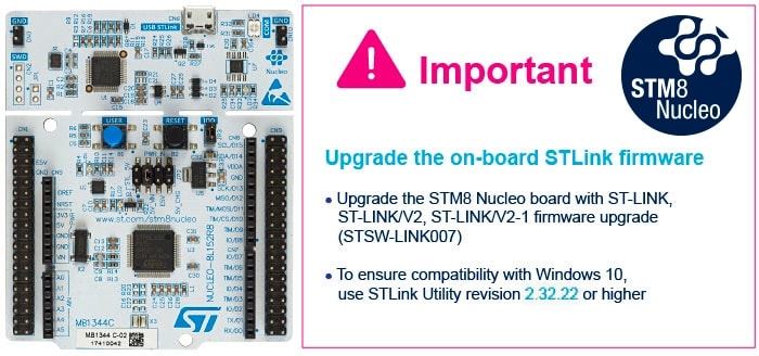 The STM8 Nucleo-64 boards do not require any separate probe as they integrate the ST-LINK/V2-1 debugger and programmer.