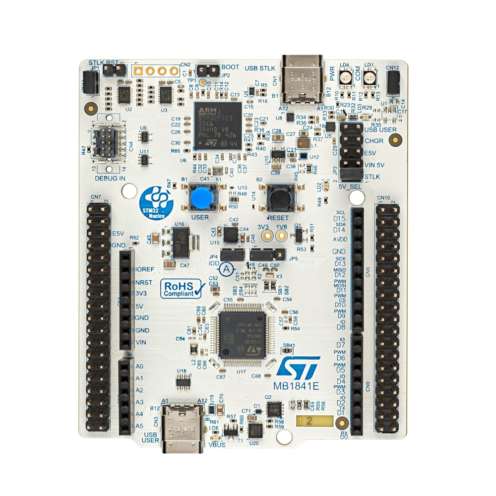 - On-board ST-LINK (STLINK/V2-1, STLINK-V3E, STLINK-V2EC, or STLINK-V3EC) debugger/programmer with USB re-enumeration capability: mass storage, Virtual COM port, and debug port
